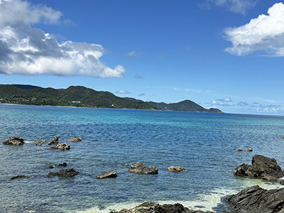 奄 美 の き れ い な 海 を 見 な が ら 名 瀬 ま で 移 動